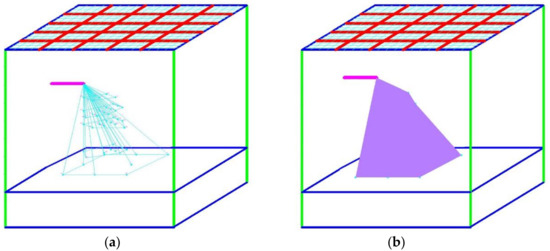 After grouting, the position of the sensors corresponding to the signal lamp light in the visualization platform is shown in Figure 6a. A rough range of grout diffusion can be seen from the visualization system, as shown in Figure 6b. To obtain a more accurate grout diffusion pattern, the three-dimensional coordinate data of the sensors were exported from the visualization platform and put into MATLAB (7.14 version, Branch office of MathWorks in China, Beijing, China, 2012). Through these data, the grout diffusion pattern was synthesized by the interpolation method embedded in MATLAB. There are two kinds of interpolation methods in MATLAB when the two known arrays are used as independent variables, namely, two-dimensional interpolation (Interp2) and two-dimensional scattered point interpolation (Griddata). The Interp2 method is characterized by the gradient distribution of independent variables in the range, which can form a regular matrix. The Griddata method is characterized by the scattered distribution of independent variables in the range, which is not a uniform distribution. In this experiment, the two independent variables are the gradient distribution and the regular matrix, which can be formed. Therefore, the Interp2 method is used. The obtained grout diffusion pattern is as shown in Figure 7. It can be seen that the flow pattern of the grout in fractured porous rock mass has a parabolic shape from the grouting hole to the bottom. The lower the level is, the larger the diffusion range of the grout is. In the horizontal direction, the grout diffusion surface around the grouting hole was an asymmetrical circular surface.