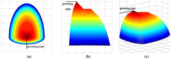 Grout diffusion pattern: (a) Top view; (b) Side view; and (c) Three-dimensional diagram.