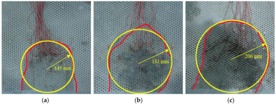 To obtain quantitative data of the grouting diffusion radius, plastic nets were arranged on three different layers of grouting. After grouting, the diffusion range of the paste on different plastic layers was measured. Considering the convenience of the measurement and later calculation, the diffusion surface of the different layers was circularly processed. Figure 8 shows the grout diffusion range monitoring diagrams for different levels of experiment 1, and Table 4 shows the range of the grout diffusion for different levels during different experiments.
