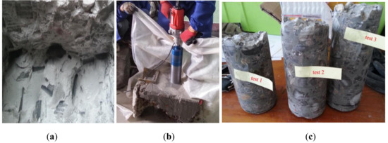 Coring of the grouting stone bodies: (a) Grouting stone bodies; (b) Coring; and (c) Cores.