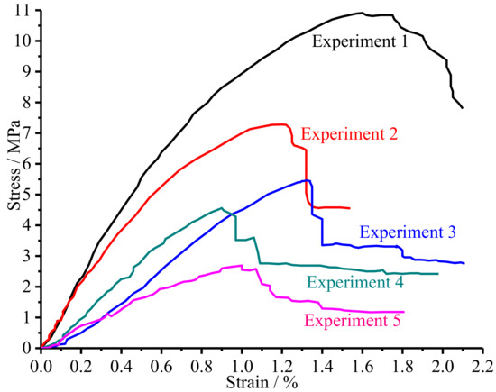 After 28 days’ placement in the laboratory, the grouting stone bodies were cored to test the uniaxial compressive strength, as shown in Figure 9b,c. Cores with a diameter of 50 mm and a height of 100 mm were used to obtain the main mechanical properties. The stress-strain curves of the cores of different experiments are presented in Figure 10. The uniaxial compressive strength of a different experiment is listed in Table 5. It can be seen that the stress-strain curves of the five experiments have the same trend, but the uniaxial compressive strength is significantly different.