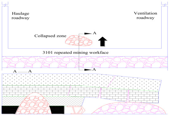 Figure 11 shows the layout of the 3101 repeated mining working face of the Shenghua coal mine. The 3101 repeated mining working face adopts an inclined longwall tilt mining layout, the length of the working face is 300.0 m, and the mining height is 2.5 m. However, there was a collapsed zone in front of the repeated mining working face, which has a tendency length of approximately 25.0 m and a height of approximately 7.0 m.