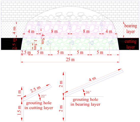 According to the influence of the grouting consolidation in different layers on safe mining, the consolidation can be divided into a cutting layer and a bearing layer from the bottom to the top. The function of the cut bed is to ensure the stability of the broken surrounding rock after grouting and is easy to cut by a shearer, so the required strength is relatively low. The grouting height of the cutting layer is equal to the mining height, which is 2.5 m. The function of the bearing layer is to form an artificial false roof, which can provide the force surface of the hydraulic support and prevent the influence of gangue caving on the working face. The height of the bearing layer is 4.0 m.
