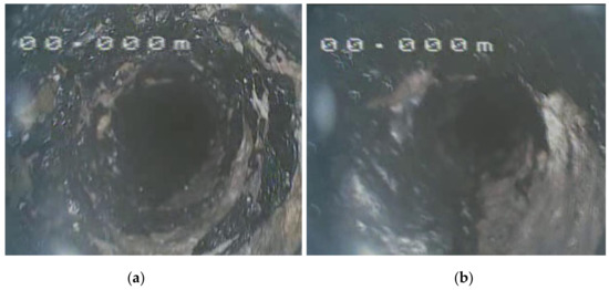 The caving area in front of the working face is essentially formed by the caving coal and rock blocks in the early stage of small coal mine mining. After different sizes of coal and rock blocks were stabilized, a large number of voids of different sizes were produced. It can be seen from the borehole images (Figure 14) that the grout is vein-like and discontinuously distributed after filling the voids between the blocks. This shows that the selected cement grout has good fluidity and that the grout diffused into the voids and formed a network skeleton after condensation. The whole structure of loose fractured rock mass was changed by grouting.