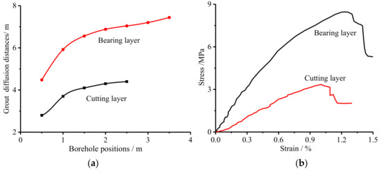 To study whether the diffusion radius of grout reaches the required range, a horizontal drilling observation was performed at different layers of the bearing layer and cutting layer to observe the diffusion distances of the grout at different positions, as shown in Figure 15a. It can be seen that the minimum radius of the grout diffusion in the cutting layer is 2.8 m, which is beyond the designed radius of 2.5 m, and the minimum radius of the grout diffusion in the bearing layer is 4.4 m, which is beyond the designed radius of 4.0 m. Therefore, the range of grout diffusion reached the design requirements. Moreover, uniaxial compression experiments on the core specimens taken from drilling were conducted, and the stress-strain curve were obtained, as shown in Figure 15b. It can be seen that the uniaxial compressive strength of the core specimens of the bearing layer and the cutting layer were 8.65 MPa and 3.35 MPa, respectively. The actual strengths are higher than the design strengths, and the strength of the fractured porous rock mass significantly increased.
