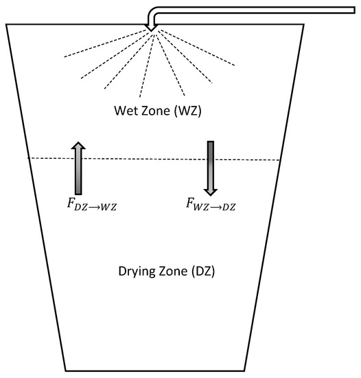 For the compartmental modelling, the granulator is divided into zones based on the dominating mechanism occurring in a particular part of the granulator. The top of the granulator is the first compartment, named the Wet Zone (), as in this area, the particles are becoming wet; whereas, the bottom of the granulator is called the Drying Zone (), as the liquid binder on the particles is becoming dry because of the hot air. The schematic diagram of the compartment modelling of the system is shown in Figure 2. The assumptions that were made for the development of the model are given below: