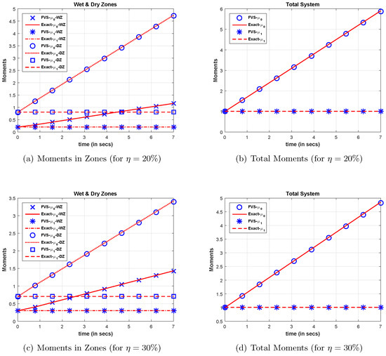 In addition, the first order moments computed corresponding to both zones (wet and dry) showed consistent numerical results, that is they agreed well with the analytical first moments. This affirms that the total mass in both zones remained conserved. Moreover, Figure 3d exhibits the comparison of the total mass in the system (combining wet and dry zones), which coincides well with the analytical total first moment. Furthermore, the quantitative relative errors of the zeroth and first order moments calculated using (19) are listed in Table 1. One can observe that the relative errors in the moments of both zones, as well as in the total system increased as the size of the wet zone was incremented from to .