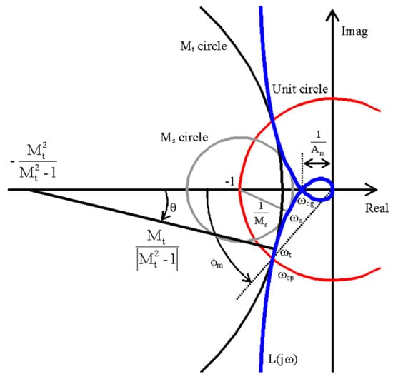 In PID control design, in addition to closed loop stability, it is common to specify some quantitative measures of “how far from instability” the nominal loop is. In this work, four robustness conditions are considered: Maximum sensitivity Ms, maximum complementary sensitivity Mt, phase margin ϕm, and gain margin Am. They are represented in Figure 2. The gain margin indicates how much the controller gain can be increased before reaching the stability limit, and it is calculated using the smallest frequency (ωcg), where the phase lag of the open-loop transfer function is 180°. The phase margin is the phase lag required to reach the stability limit at the frequency ωcp, where the Nyquist plot intersects the unit circle. Both gain and phase margins are classical measures of relative stability, and both margins must be positive to assure stability for stable open-loop processes. The maximum sensitivity Ms is the reciprocal to the radius of the circle with center in point −1 and tangent to the Nyquist plot at ωs, so it measures the shortest distance to the critical point −1. Similarly, the maximum complementary sensitivity Mt is related to the shortest distance from the Nyquist curve to another circle with it’s center at a negative real axis point and enclosing the critical point −1. The requirements that maximum sensitivity and complementary sensitivity are less than Ms and Mt, respectively, imply that the Nyquist plot must be outside the corresponding circles [].