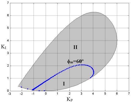 These specifications provide a set of acceptable values of the controller parameters describing the boundary curves for the corresponding frequency domain requirements in the parameter plane KP-KI or KP-KD []. However, it is also necessary to guarantee the closed-loop stability in the PID controller design, which involves a boundary stability region in the same controller parameter spaces. The next subsections explain the calculation of the stability regions and the frequency requirement boundary curves for five types of PID controllers.