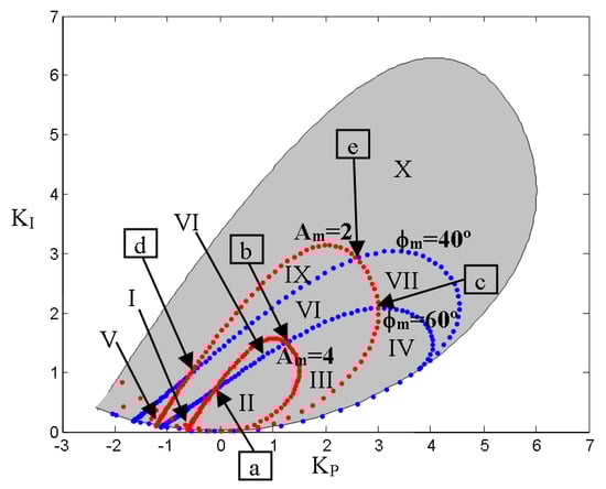 In addition, when different requirements or two values of the same specifications are combined, it is possible to obtain useful information. For the non-minimum process in Equation (5) and the PIDα control, Figure 4 shows how four boundary curves (ϕm = 60°, ϕm = 40°, Am = 4, and Am = 2) split the stabilizing region into ten zones (from I to X), highlighting five interesting points (from a to e) where two different boundary curves intersect. The achieved specifications in these zones and points are the following: