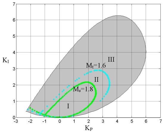 Consequently, estimating the Ms and Mt boundary curves implies more calculations than estimating the curves for ϕm and Am. For the process in Equation (5) and the PIDα control, Figure 5 shows an example where the stabilizing region is divided into three zones by the boundary curves Ms = 1.8 and Mt =1.6: I (Ms ≤ 1.8, Mt ≤ 1.6), II (Ms = 1.8, Mt ≤ 1.6), and III (Ms = 1.8, Mt = 1.6).