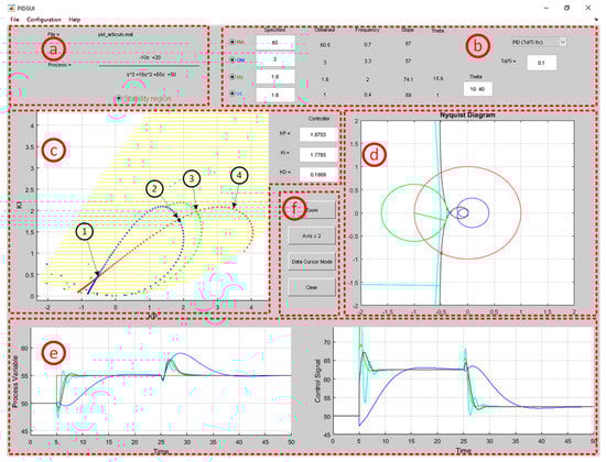 This section describes the main features of the developed interactive tool. Figure 6 describes the work flow with the tool detailing the different stages. The graphical user interface (GUI) is depicted in Figure 7. Its layout has been developed to show information about boundary curves, stability region, and frequency and time responses. The main window is divided into several differentiated parts (a–f). In the following, the main functionalities of the tool are described.