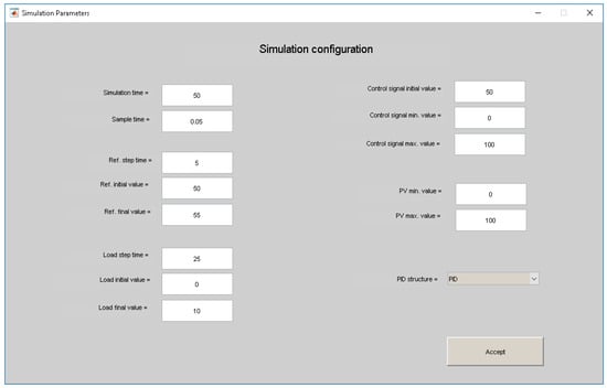 - Simulation configuration: To perform the simulations, the parameters given in Figure 8 are configured. The range of the output and input process variables is from 0 to 100, and their initial values are 50. Step changes are applied from 50 to 55 in the set-point, and from 0 to 10 in the load disturbance, at times t = 5 s and t = 25 s, respectively. The total simulation time is 50 s, and the controller sample time is 0.05 s with PID structure.