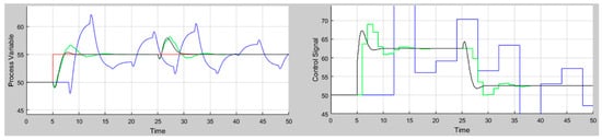 - Considering practical aspects: Assuming that design 2 is the preferred one, Figure 9 shows the closed loop time responses obtained with different controller sample times: 0.05 s (black line), 1 s (green line), and 4 s (blue line). For a sample time of 1 s, the closed-loop response is acceptable and a bit more oscillatory than that obtained with a sample time of 0.05 s. Nevertheless, the response is considerably deteriorated with a sample time of 4 s.