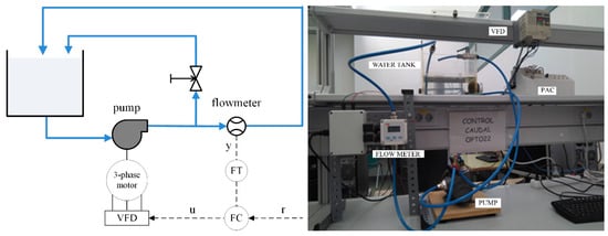 In this section, the proposed tool is used for tuning a PI controller in one of our laboratory processes. Simulation results are compared to those obtained on the real system. As shown in Figure 10, the experimental process consisted of a control flow where water was pumped and returned to a tank. It was composed of a water tank, a three-phase pump taking the water from the bottom of the tank, an electromagnetic flow sensor measuring the flow rate to be controlled, and other connection elements such as valves and tubes. Part of the flow taken by the pump was returned to the tank by a manual valve, and the other part went through the branch where the flow meter was placed (see Figure 10). In this way, the maximum flow rate circulating by this second branch could be adjusted. The process also comprised a variable frequency drive (VFD) to manipulate the water flow rate. Finally, the control strategy was implemented using a programmable automation controller (PAC). The flow sensor and the VFD were connected to the PAC. The PAC was also connected to a computer for system monitoring and specifying the control parameters. The flow rate was the controlled process variable, and the manipulated variable was the operation frequency of the pump. The sampling period of the control system was 0.5 s.