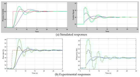 The previous model was introduced in the developed tool, and the KP and KI parameters of three different PI controllers were calculated. The control parameters and the achieved specifications are collected in Table 6. The simulated and experimental closed loop responses for each design are shown in Figure 11, where the process variable (flow rate in %) and the control signal (frequency in Hz) are depicted. A reference step of 10% was applied at t = 3 s. Although the peaks of the experimental responses were a bit higher than those obtained in simulation, there is a great similarity between the simulated (a) and the experimental (b) data. The PI 1 and PI 2 designs were tuned for a phase margin of 45° and Ms of 1.5. However, the first one provided a slower response since the corresponding frequencies ωcp and ωs were smaller than the critical frequencies of the second design. The third PI controller (PI 3) was tuned for a phase margin of 45°, maximizing the gain KI. It achieved this requirement at a ωcp of 0.9 rad/s, and it also reached a Ms of 1.7 at a ωs of 1.1 rad/s. As a consequence of the worst robustness performance, the PI 3 showed a more aggressive and oscillatory response, with a higher overshoot and greater settling time.
