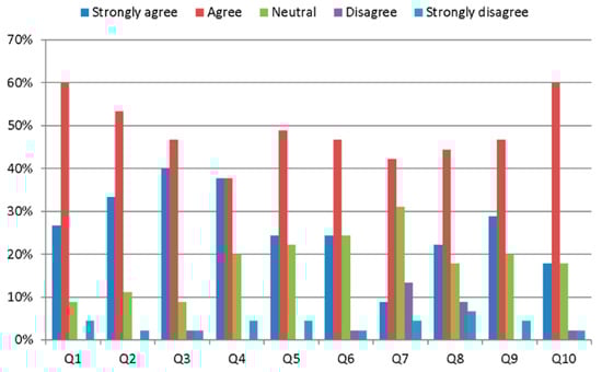 The questions were intended to collect data to study the tool contribution on the learning process of PID design in the frequency domain. The assessment and evaluation carried out was based on References [,,,,]. The questionnaire is collected in Table 7. The first three items evaluate the Learning value. The Value-added subscale encompasses the next four items. The last three items are related to the Design usability and easy understanding of the tool. The students’ responses are summarized in Table 8. They are rated as strongly disagree, disagree, neutral, agree, or strongly agree.