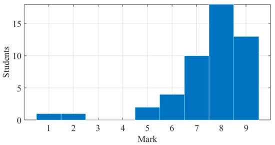 The exercises about PID controller design mentioned before were carried out voluntarily by 49 students in class. It is important to note that the students did not have a previous background related with control theory. Thus, the exercises comprised a set of basic problems and concept questions to encourage students to think about the material taught in class. The answers to the exercises were submitted through the online learning platform Moodle implemented at the University of Cordoba []. Figure 13 shows the mark distribution of the 49 students who submitted the proposed exercises. The average mark was 7.5.