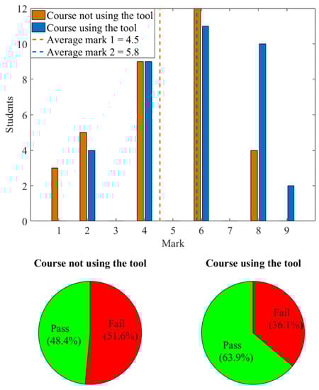 In the current year and the previous one, students of the Automatic Control course were asked to perform a theory exam about concepts on PID control and frequency domain margins. The exam was taken by 33 students in the previous years course, and 38 students in the current one. Figure 14 shows a histogram of the scored marks for both courses—‘not using the tool’ and ‘using the tool’. The average score of students in the course using the tool was 5.8, compared to the score of 4.5 of those of the previous course who did not use it. In addition, as shown in the figure, the percentage of students who passed the exam in the current course was higher (63.9%) than the other (48.4%). A possible bias influencing the results might be that the students who utilized the tool are those who took lessons seriously. Nevertheless, the results exhibit a certain evidence that the developed tool helps students in their learning process of basic concepts of PID controllers and feedback control.