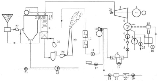 Schematic diagram of thermal power plant system. 1—boiler drum; 2—superheater; 3—steam turbine; 4—generator; 5—condenser; 6—condensate pump; 7—desalting device; 8—booster pump; 9—low pressure heater; 10—deaerator; 11—water pump; 12—high pressure heater; 13—economizer; 14—circulating pump; 15—water jet air ejector; 16—water pump; 17—drain pump; 18—water pump; 19—water pump; 20—water heater; 21—chemical water treatment equipment; 22—ash pump; 23—ash flushing water pump; 24—oil pump; 25—industrial pump; 26—forced draft fan; 27—powder exhaust fan; 28—induced draft fan; 29—chimney.