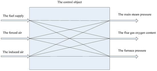 The basic task of the boiler combustion process is to make the boiler combustion provide heat to adapt to the boiler steam load demand, while also ensuring the safety and economy of the boiler [37,38]. The combustion process control system has three control variables (the fuel supply , the forced air and the induced air ) and three adjusted variables (the main steam pressure , the oxygen content in flue gas and the furnace pressure ), and the adjustment of the controlled variables have had obvious effects on each other. This is because there is a mutual influence between objects within the control variables and adjusted variables. One adjusted variable may be influenced by several control variables, and the relationship between the inputs and outputs of the combustion process is shown in Figure 2.