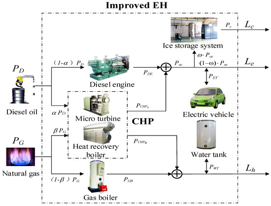 As shown in Figure 2, the improved Energy Hub model contains six energy carriers, which are CHP, diesel generator, gas boiler, ice storage system, hot water tank, and electric vehicle power exchange station. In this section, the mathematical expressions of their output power and operation constraints will be introduced.