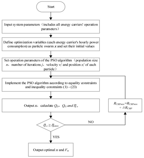 In order to obtain the optimal fuel costs of the integrated energy system, this paper took the objective function min F, defined in Section 3.1, as the fitness function, and selected a different energy carriers’ hourly power consumption as the optimization variable to optimize the fuel costs of the integrated energy system by the PSO. In addition, to make full use of fossil energy and to improve energy efficiency, it was necessary to verify whether the overall efficiency of CHP met the minimum requirement. If the overall efficiency of CHP cannot meet the minimum requirement, the minimum CHP heat to power ratio should be adjusted and the PSO iteration process should be repeated. Equation (25) is the mathematical expressions of the overall efficiency of CHP: