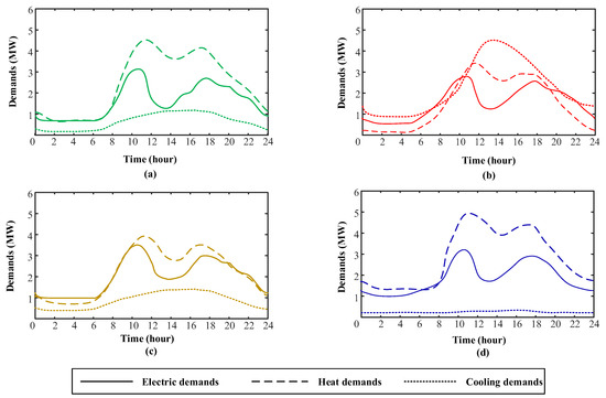 In this paper, an off-grid integrated energy system located in the central of China was selected as an example to verify the proposed Energy Hub model and operation strategy. All energy carriers used to supply, convert, and store energy for the integrated energy system are shown in Figure 2. In addition, the integrated energy system was equipped with a state-of-the-art CHP unit, whose waste heat boiler is an additionally fired waste heat boiler. This made the heat to power ratio of CHP adjustable. The rated power of CHP was 3 MW and its rated electrical output efficiency was 33%. The thermal output efficiency was constrained by the supplementary volume of diesel oil, which is shown in Equation (4). A 10 MW diesel generator was installed in the integrated energy system to supply additional power and its energy conversion efficiency was 40% [27]. In order to make full use of the capacity of gas boiler and ice storage system, the integrated energy system deployed a 5 MW gas boiler to generate additional heat and two sets of ice storage air conditioning units with the rated power of 5 MW and 4 MW to supply cooling demands. Moreover, since the installation cost of the hot water tank is relatively cheap and the recovery of waste heat is conducive to improving the overall energy efficiency, this paper assumed that the installation capacity of the hot water tank was large enough to collect redundant heat generated by the integrated energy system. Conversely, due to the high installation cost of the battery and the limited number of electric vehicles, the maximum storage capacity of the electric vehicle power exchange station was set as 900 kWh, and the daily electrical energy needed to be supplied by the electric vehicle power exchange station was set as 500 kWh. Figure 4 shows the seasonal cooling, thermal, and electrical load curves of the integrated energy system.