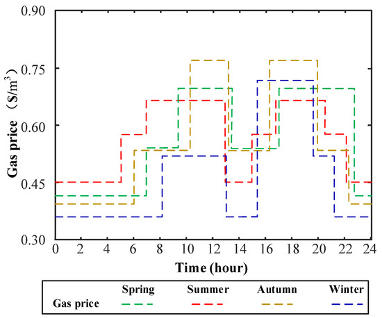 Since diesel price is less sensitive to loads and relatively cheap, it was assumed that diesel price was only affected by seasons in this paper. The purchasing costs of diesel were 1.034, 0.983, 1.025, and 1.051 US $/L in spring, summer, autumn, and winter [28]. However, with the rapid development of distributed CHP and gas boilers, there is a significant increase in nature gas consumption, which eventually leads to the shortage of natural gas at peak gas demand time [29]. Therefore, by analogy to the time-of-use electricity price, this paper formulated the time-of-use gas price according to the daily cooling, thermal, and electrical loads to optimize daily fuel costs. Figure 5 shows the seasonal time-of-use natural gas purchasing costs.