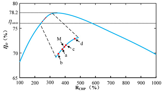 Figure 6 reveals the relationship of CHP heat to power ratio and its overall efficiency. As can be seen from Figure 6, with the increase of the CHP heat to power ratio, CHP overall efficiency (ηo) increased at first and then decreased. The overall efficiency of CHP can reach its maximum value of 78.2% when the heat to power ratio of CHP is 337%. However, CHP overall efficiency started to decrease shortly after it reached its maximum value. This was because, with the increase of the supplementary volume of diesel oil, the temperature of the waste heat boiler’s exhaust smoke rose as well, which made the supplemented diesel oil have a lesser effect on improving the waste heat boiler’s efficiency and eventually reduced CHP overall efficiency.