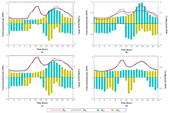 Figure 7 shows the seasonal output power of the ice storage system and the equivalent average daily electrical load curve before and after the cooling loads were independently considered. In Figure 7, PC1 and PC2 represent the operation states of two ice storage devices. When the cooling loads are greater than zero, the ice storage system is in the ice melting state; otherwise, the ice storage system is in the ice making state. In addition, PT1 is the equivalent average daily electrical load curve before independently considering cooling loads (the cooling loads are converted to real time electrical loads). PT2 is the equivalent average daily electrical load curve after independently considering cooling loads (the cooling loads can participate in the demand response program).