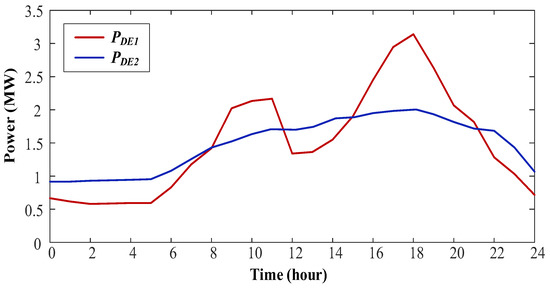 Except for the smoothing daily load curve, independently considering system cooling loads is also helpful for reducing diesel generator installation capacity. Taking summer as an example, PDE1 and PDE2 in Figure 8 represent the average daily output power of diesel generators before and after the cooling loads were independently considered.