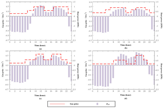 Optimal thermal storage output and time-of-use gas price in (a) spring; (b) summer; (c) autumn; (d) winter.