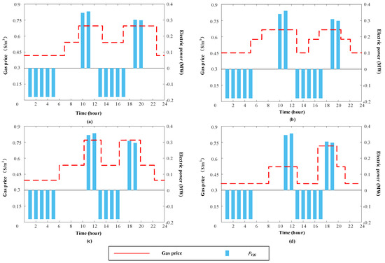 Optimal output power of the electric vehicle power station and time-of-use gas price in (a) spring; (b) summer; (c) autumn; (d) winter.