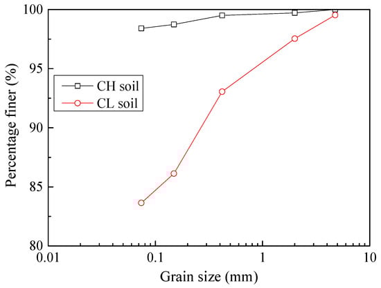 Grain size distribution of Nandipur (CH) and DHA (CL) soil samples.