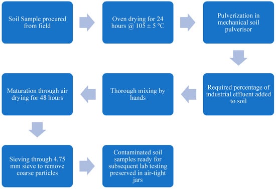 A systematic methodology was adopted to prepare the leachate contaminated soil specimens. The cohesive soil samples were first oven-dried and pulverized. Industrial effluents were then thoroughly mixed with the soil samples at the indicated percentages of 0%, 5%, 10%, 15%, and 20% by dry weight of soil. The soil-effluent blends were left for 48 h for maturation before initiating laboratory testing. The contaminated soil samples were then air-dried and sieved through 4.75 mm mesh to remove coarse particles as well as large lumps. The dried and sieved soil was stored in airtight containers ready for laboratory testing. Sixteen polluted specimens, with different effluent proportions, were prepared for each soil type. A typical flow-chart depicting the specimen preparation process is shown in Figure 5.