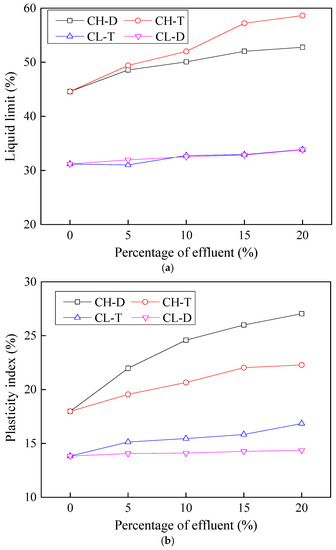 Increases in the liquid limit and plasticity indices of the soils with the addition of acidic and basic effluents are illustrated in Figure 6. The liquid limit of CH soil was found to increase from 44.58% to 52.77% upon contamination from the acidic effluent. With the basic effluent, CH soil’s liquid limit increased to 58.63% at a 20% addition of the contaminant. CL soil showed an increase in liquid limit from 31.18% to 33.82% and 33.86% upon addition of acidic and basic contamination, respectively.
