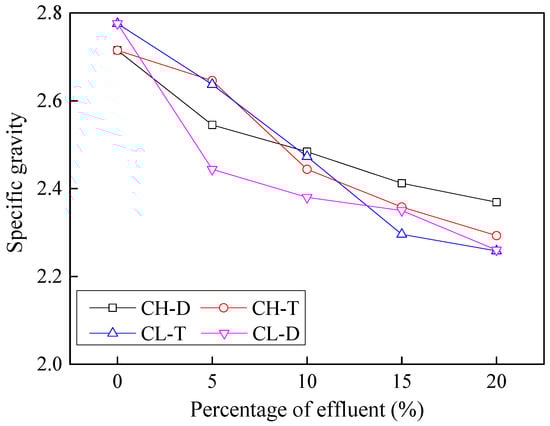 Specific gravity of soil solids indicates how much heavier or lighter the soil particles are compared to water at 25 °C. This characteristic is important, specifically with regards to settlement evaluations in soils. The effects of contaminants on specific gravity are illustrated in Figure 7. The specific gravity of both the soil samples decreased with the addition of contaminants. CH soil showed a decrease in specific gravity by 12.5% and 15.5% for the acidic and basic effluents, respectively. CL-specific gravities decreased by 22.83 and 22.94 for the acidic and basic effluents, respectively.