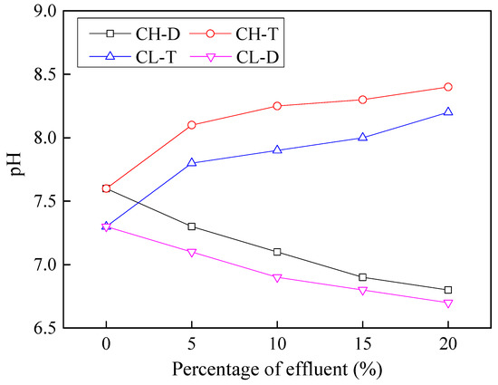 The two effluents used in this study comprised of samples recovered from dyeing industry and a tannery. Specimen from dyeing industry was acidic (pH = 5.1) in nature whereas the one from tannery was basic (pH = 11.5) in characteristic. Changes in the pH of soil can increase its chemical aggressivity which can cause excessive deterioration of the structural materials placed over it. The effects of contaminants on the pH of cohesive soils appear in Figure 8. At 5% contamination, the pH of all soils showed a sudden increase in pH value compared to unaffected soils. The basic effluent at 20% concentration caused an increase in pH to 8.2 and 8.4 for CL and CH soils, respectively. The acidic effluent at the same concentration caused a decrease to 6.7 and 6.8 for CL and CH soils, respectively.