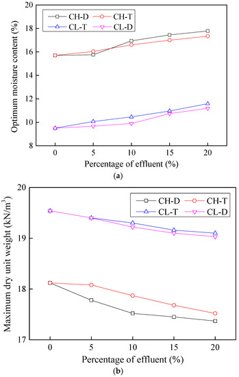 Compaction characteristics of soil, i.e., optimum moisture content and maximum dry unit weight, are important engineering characteristics with regards to subgrade preparation for roads, highways, and building structures. An increase in optimum moisture content of soil indicates a high water demand to achieve a certain density under same compactive effort. A higher maximum dry unit weight, on the other hand, indicates a relatively stronger material having better engineering utility. The effects of contaminants on the compaction characteristics of cohesive soils are shown in Figure 9. In general, the optimum moisture content was observed to increase by around 21.9% for CL soil and around 13.2% for CH soil with the addition of contaminants. On contrary, the effluents consistently decreased the maximum dry density of cohesive soils with an increase in contaminant percentage for all types of soils.