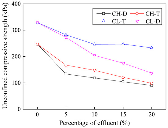 The reason for the decrease in unconfined compressive strength may also be due to the decrease in cementing material. Cementing agents in soil help to bond the finer particles together, forming aggregates. Due to leaching, however, these aggregates disintegrate along with the cementing agents. Thus, it stands to reason that both effluents alter the cementing agents in the soil particles and hence decrease unconfined compressive strength.