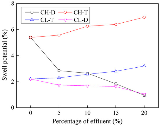 The swell potential of soil indicates its ability to swell upon wetting. A higher swell potential (and the corresponding swell pressure) is highly undesirable for the structures as it can cause severe cracks and destress in the buildings. The effects of contaminants on soils’ swell potential appear in Figure 11. The swell potential of CL and CH soil samples increased by 44.8% and 28.7% with the addition of 20% basic effluent. On the contrary, the swell potential of both the soil samples decreased with the addition of effluent from dyeing industry because of its acidic nature. The observed decrease in swell potential of CL and CH soil samples with 20% contamination of acidic effluent was 52.5% and 82.4% respectively.