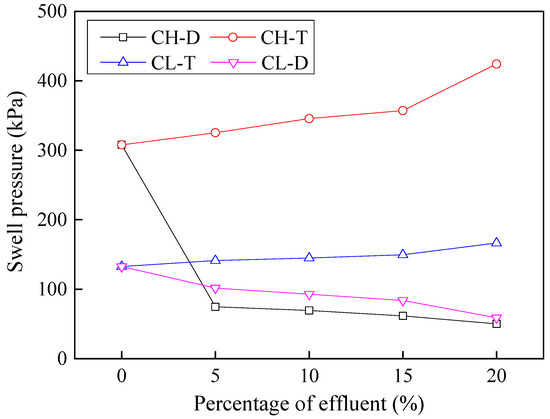 The effects of contaminants on soil swell pressure are illustrated in Figure 12. Swell pressure showed a decreasing trend with acidic contamination (i.e., dyeing). In particular, CH swell pressure suddenly decreased with a slight addition of 5% of acidic effluent. Whereas the swell pressure increased with basic effluent.