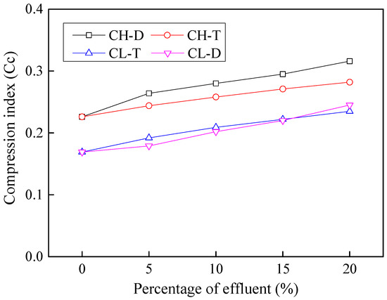 - Contamination with industrial effluents was observed to cause around 30%–40% increase in compression index Cc of soil. An increase in Cc value suggests that the tendency of the soil to shrink or expand upon the intrusion of moisture is enhanced, which can lead to distress in structures constructed on such soils.
