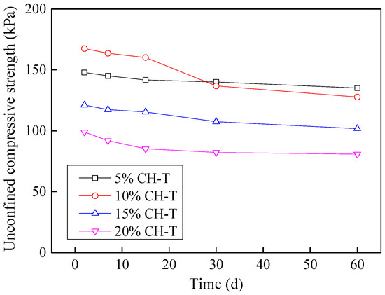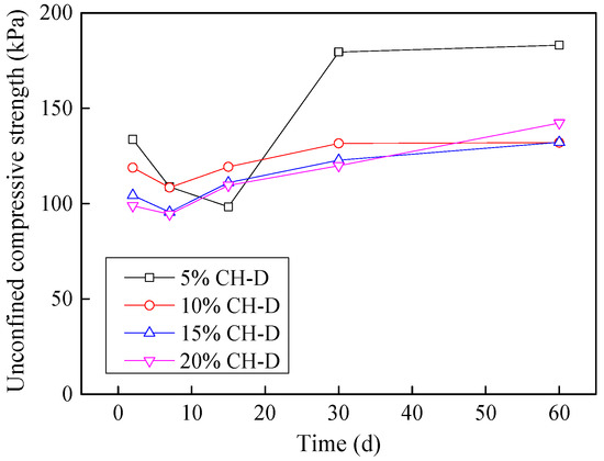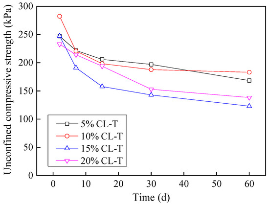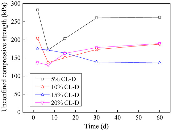 The unconfined compressive strength for 15% CL-dyeing constantly decreased from 2 days to 2 months, while the unconfined compressive strength for the other samples began to increase after 7 days. However, the final strength after 60 days was still less than the unconfined compressive strength of the original (i.e., virgin) soil samples, suggesting that effluent effects diminished after a certain period after which the soil began to regain its strength. As such, dyeing effluent appears to have a temporary effect on CL soil.