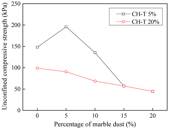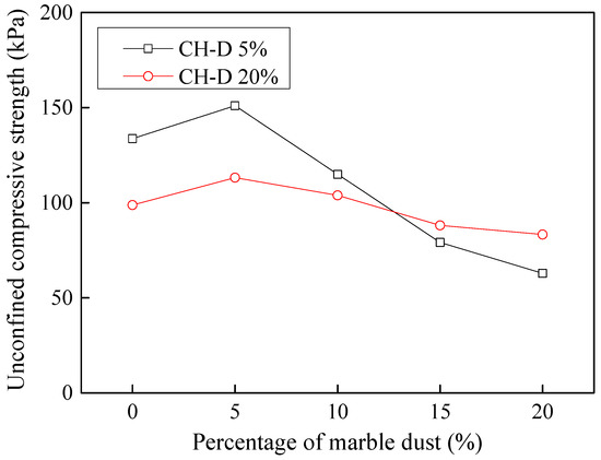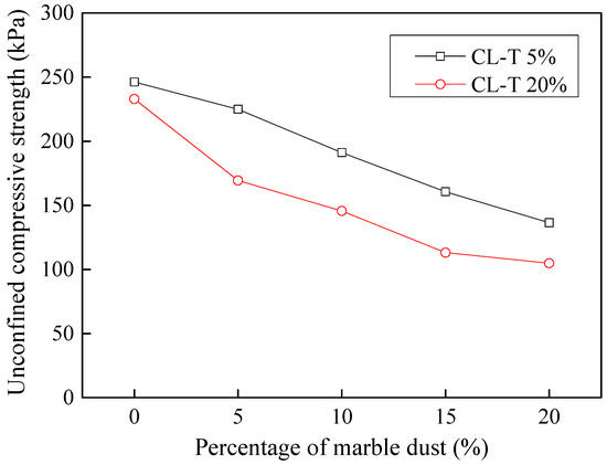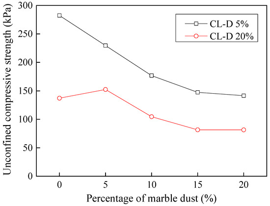 Figure 18 illustrates the trends observed when different percentages of marble dust were added to the acid-affected CL soil. An increase in marble dust concentration caused a rapid decline in unconfined compressive strength from 282.42 kPa to 141.55 kPa at 5% acidic contamination. At 20% acidic contamination, unconfined compressive strength decreased from 137.14 kPa to 81.49 kPa when marble concentration reached 20%. A possible reason for this trend is that CaO, a primary and basic component of marble dust, reacted with the acidic part of the effluent present in the soil. This would have produced salts that were responsible for the rapid decrease in unconfined compressive strength. Although it is a renowned soil stabilizer, marble dust was unable to improve soil strength to match that of the original soil “i.e., 328.9 kPa”.