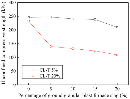 GGBFS has a pH that varies between 10 and 12. As such, there may have been a possible reaction between acid from the contaminated soil and the basic compounds present in the GGBFS, which could have produced salts that ultimately resulted in a decrease in unconfined compressive strength. It may therefore be concluded that GGBFS is not an effective stabilizer in acid-contaminated soils.