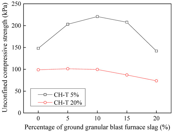 Improvement of weak soil by using various industrial by-products is a well-established practice worldwide. Several studies have successfully shown the significance of using different industrial by-products like marble dust [22,23], glass dust, blast furnace slag [24,25], rice husk ash [26], sugar cane waste, fly ash [27,28], coal ash [29], xanthan gum [30], etc., for soil improvement. As phase-2 of this research, the possibility of stabilization of leachate contaminated cohesive soils (CL-dyeing, CL-tannery, CH-dyeing and CH-tannery) using marble dust and ground granulated blast furnace slag (GGBFS) was explored. Soil specimens (CL and CH) having 5% and 20% effluent contamination were mixed with varying percentages of marble dust as well as GGBFS and their effect on unconfined compressive strength was explored. The main objective was to access possible enhancement in undrained strength of contaminated soils, as is the case with soils having no such contamination.