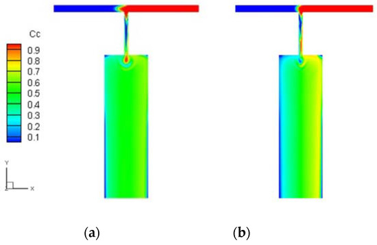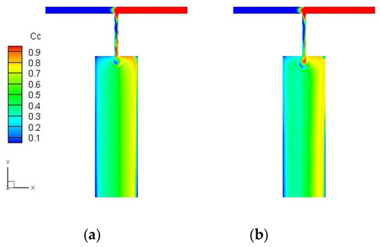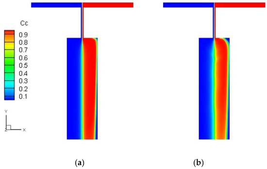 Concentration distribution in the Newtonian fluid case (a) and viscoelastic fluid case (b) under constant driving pressure at both inlets.