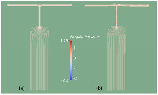 Streamlines and angular velocity in the Newtonian fluid case (a) and viscoelastic fluid case (b) under constant driving pressure at both inlets.